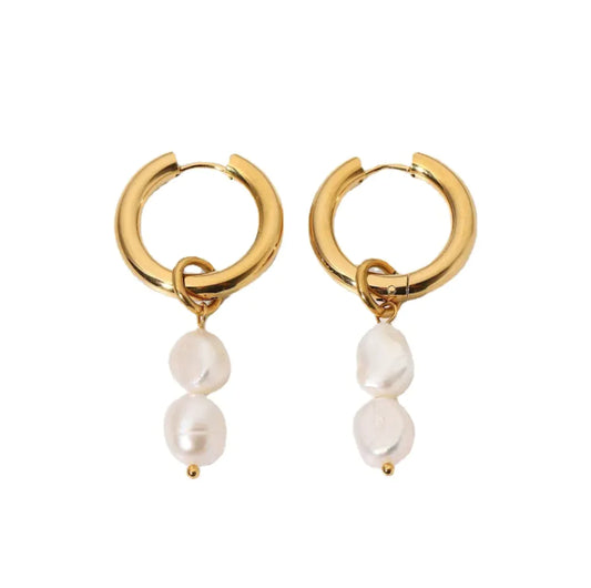 Precio habitual $15.00 USDPrecio habitualPrecio unitario / porPrecio de oferta $15.00 USDPendientes colgantes con doble perla de agua dulce - Acero inoxidable bañado en oro